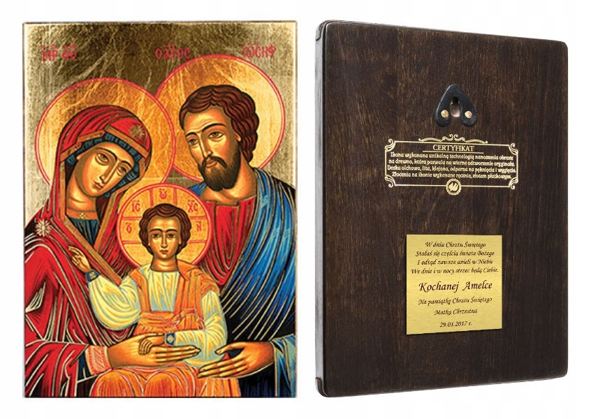 Wyjątkowo piękna ikona z wizerunkiem świętej rodziny wykonana na desce olchowej unikalną techniką nanoszenia obrazu bezpośrednio na drewno. Obraz świętej rodziny, ukazuje zjednoczenie komunię osób. Podanymi sobie rękoma oboje trzymają i obejmują … Dziś ikony świętej rodziny mogą być wspaniałym prezentem dla narzeczonych lub nowożeńców. Ikona opatrzona została wytłoczonym i złoconym certyfikatem autentyczności. Jednocześnie obraz ten wyraża zjednoczenie, miłość, życie małżeństwa i rodziny chrześcijańskiej, która wpatruje się w swoim dążeniu do świętości i do tworzenia kościoła domowego we własnym małżeństwie i rodzinie. Obraz świętej rodziny kaliskiej przedstawia najświętszą maryję pannę, świętego józefa i jezusa chrystusa w drodze powrotnej z miasta, po jego odnalezieniu w świątyni.. Motyw ten jednak nie w pełni odpowiada kanonom tradycji ikonograficznej.